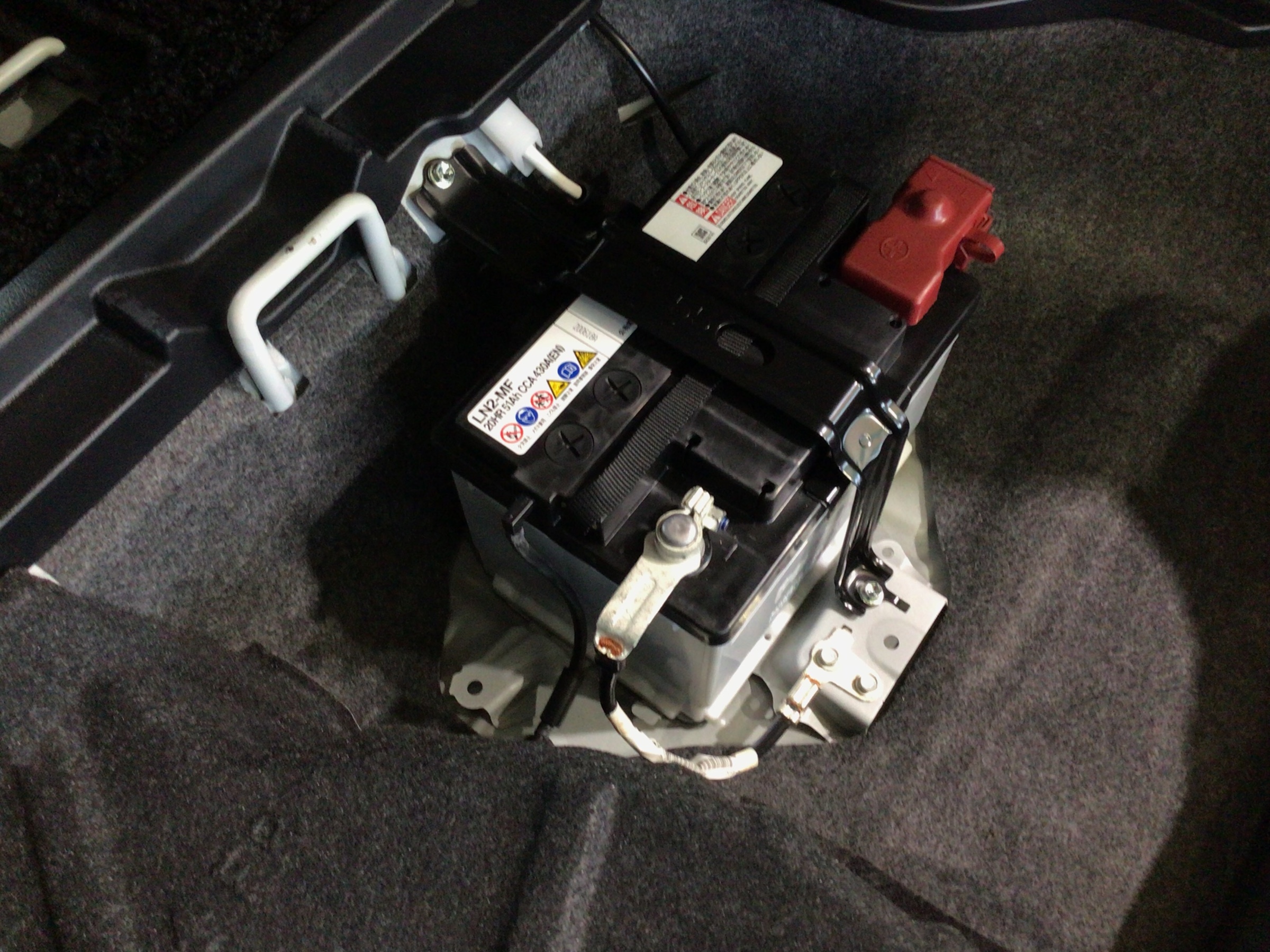 トヨタのハイブリッド車の補機バッテリーは、トランク内やリアシート下にある事が多いですね!