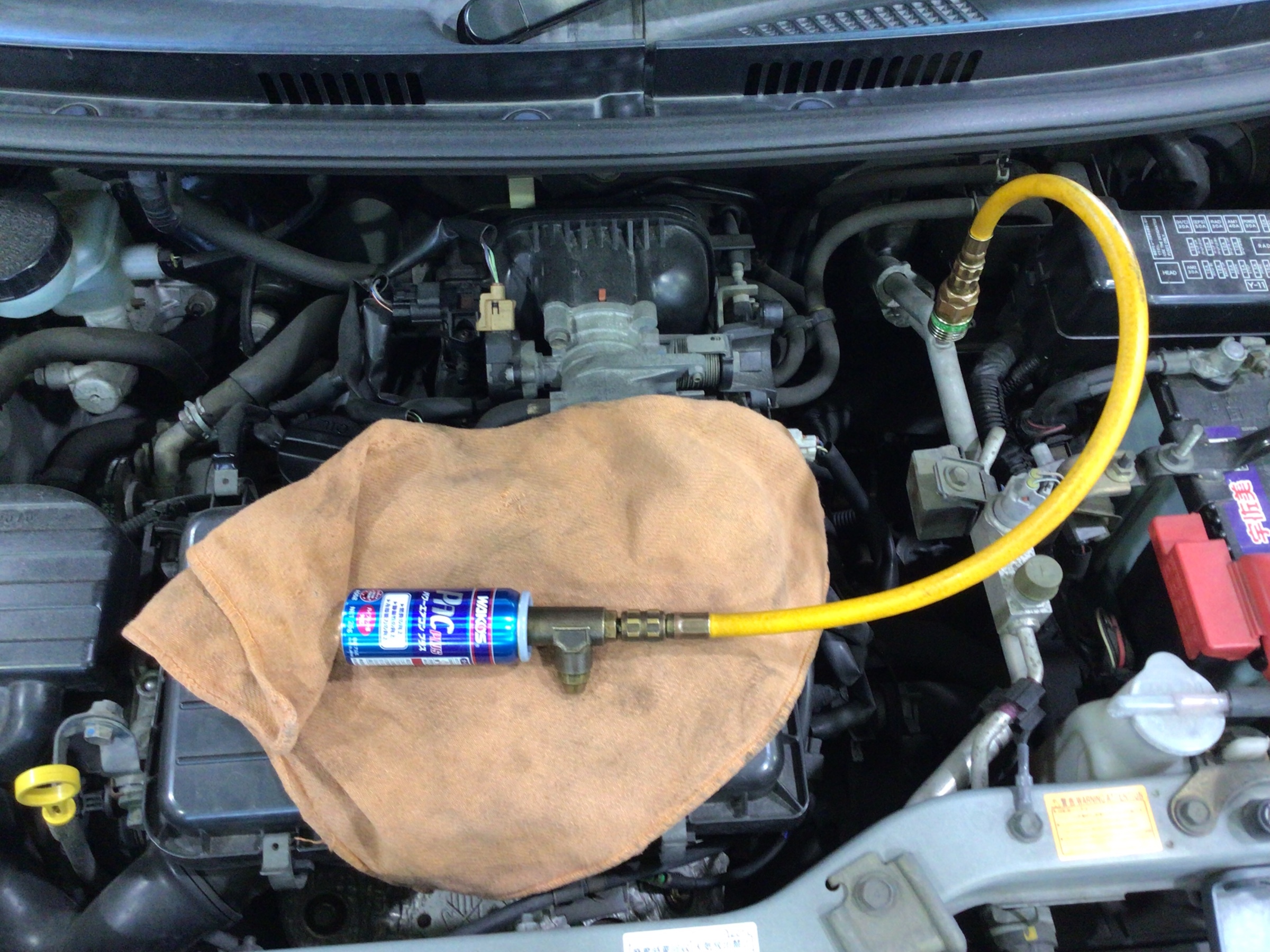 本日も、当店お馴染みエアコン添加剤の作業ですよ〜