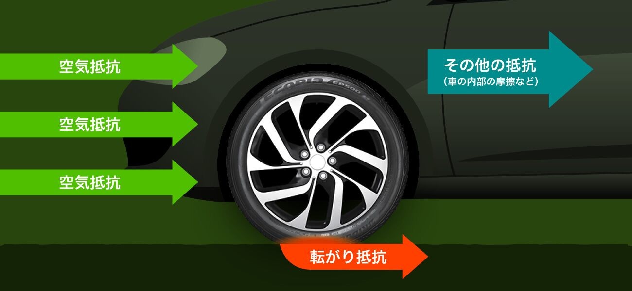 走行中の車には、空気抵抗やタイヤの転がり抵抗など車の走行を妨げる様々な抵抗力が働いています。これらの抵抗を小さくすることで車はより少ないエネルギーで走行できるようになり、燃費性能の向上に繋がります。