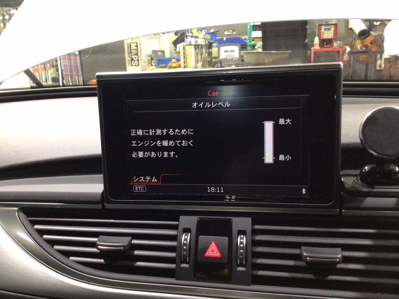 車内のモニターから、オイル量を測定します。