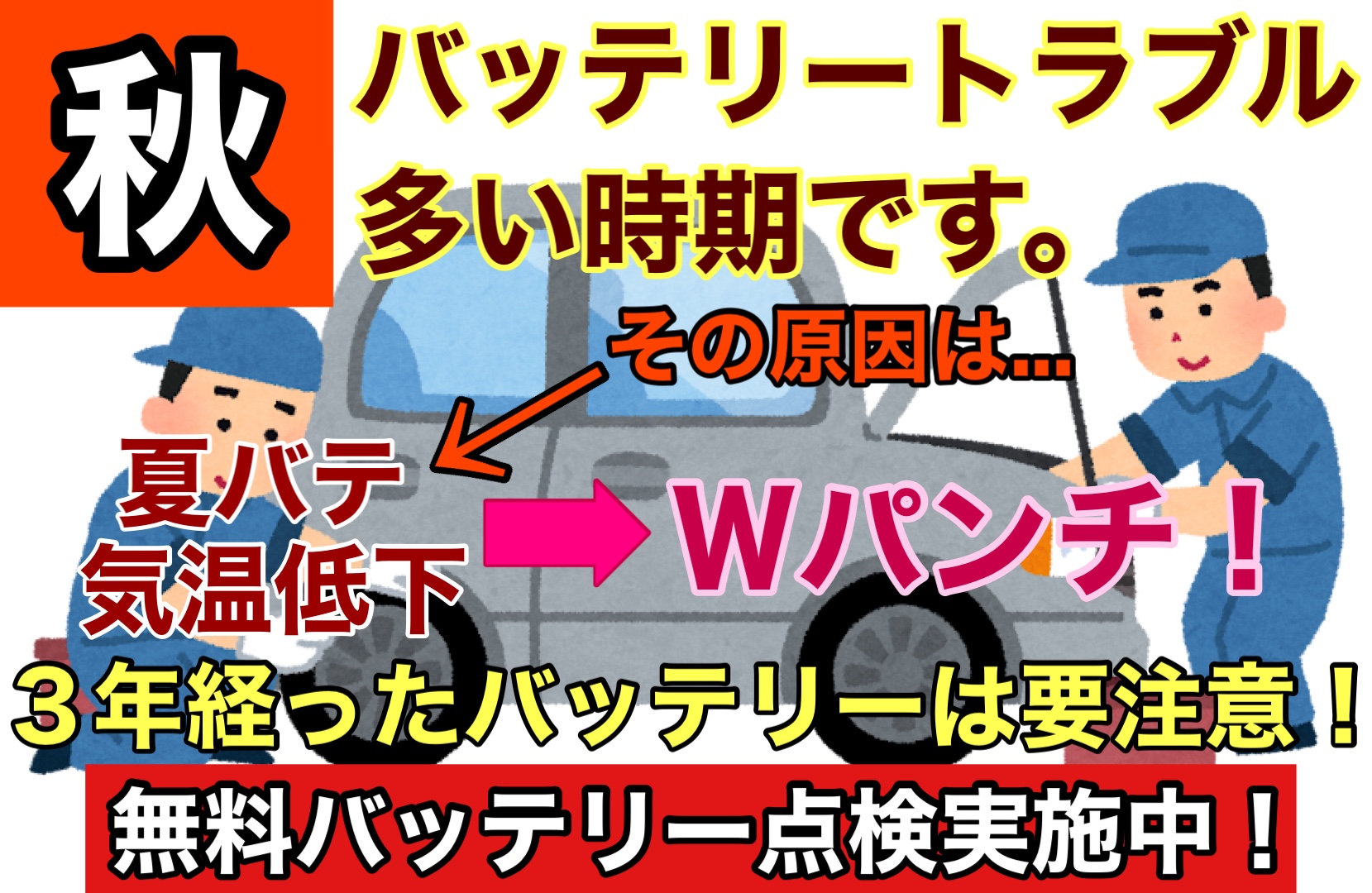 夏はクルマに乗る度にカーエアコンを使いますが、それは、とても多くの電気を消費するためカーバッテリーにはとても大きな負担が掛かっています。秋になる頃には、カーバッテリーはヘトヘトに。それに追い打ちをかけるように、気温が下がってきます。ただでさえ、気温の変化に弱いカーバッテリーはそれらのダブルパンチで、突然エンジンが掛からなくなる「バッテリー上がり」を引き起こしやすくなります。