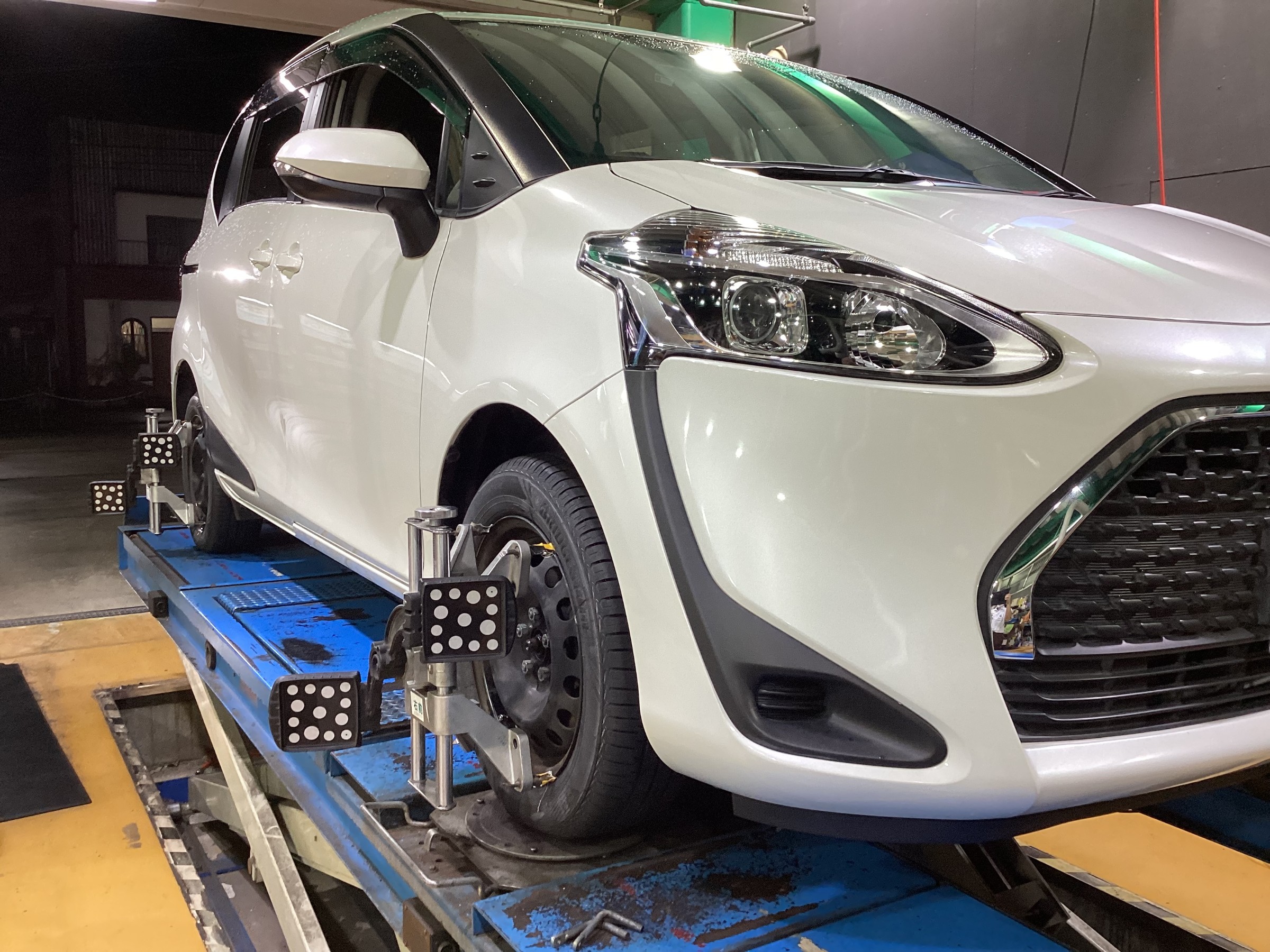 トヨタ シエンタのタイヤ・ホイールにセンサーを取り付け、タイヤの取付角度のミリ単位の数値を測ります。その数値が自動車メーカーが定める数値の範囲内かそうでないかをチェックします。