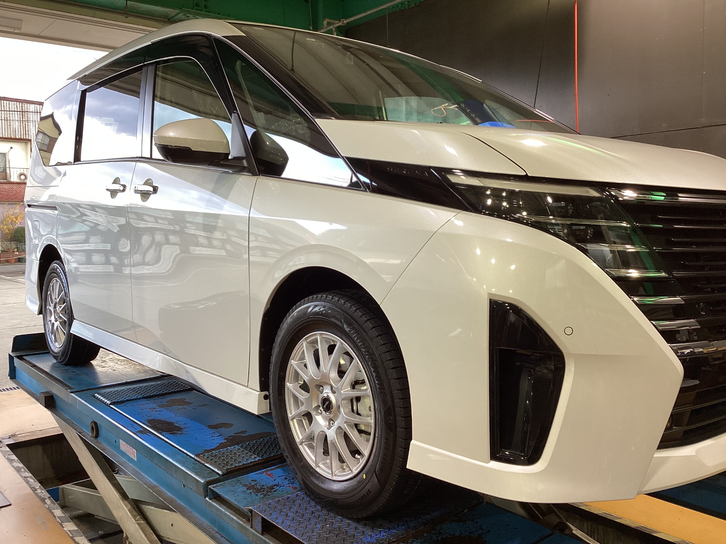 ニッサン新型セレナのスタッドレスタイヤホイールセットの装着作業です。