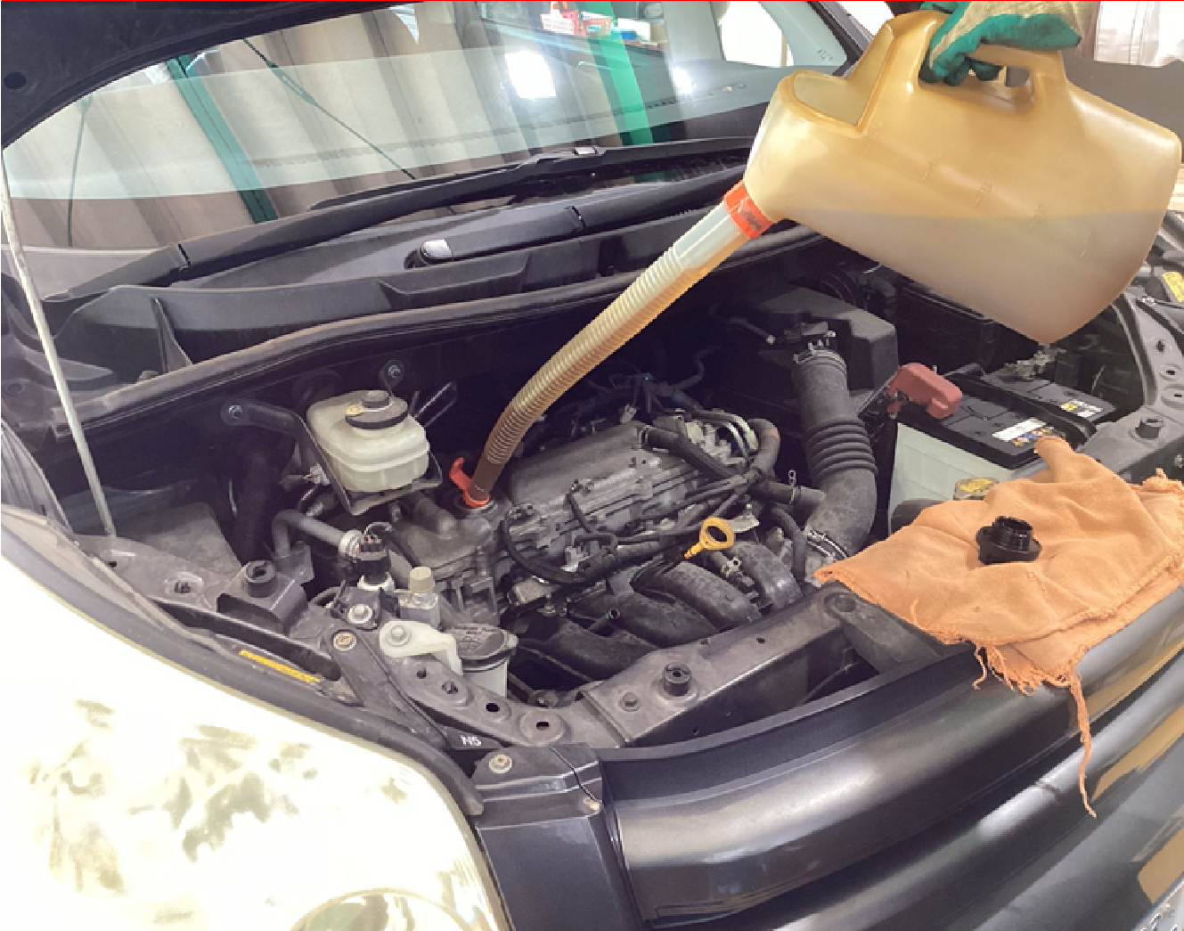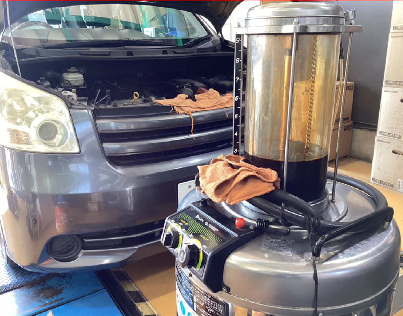 今回、オイルエレメントの交換は無いためオイル上抜きチェンジャーを用いて交換を実施しました。オイルレベルゲージの差し込みを使用して使用済みオイルを抜き取ります。