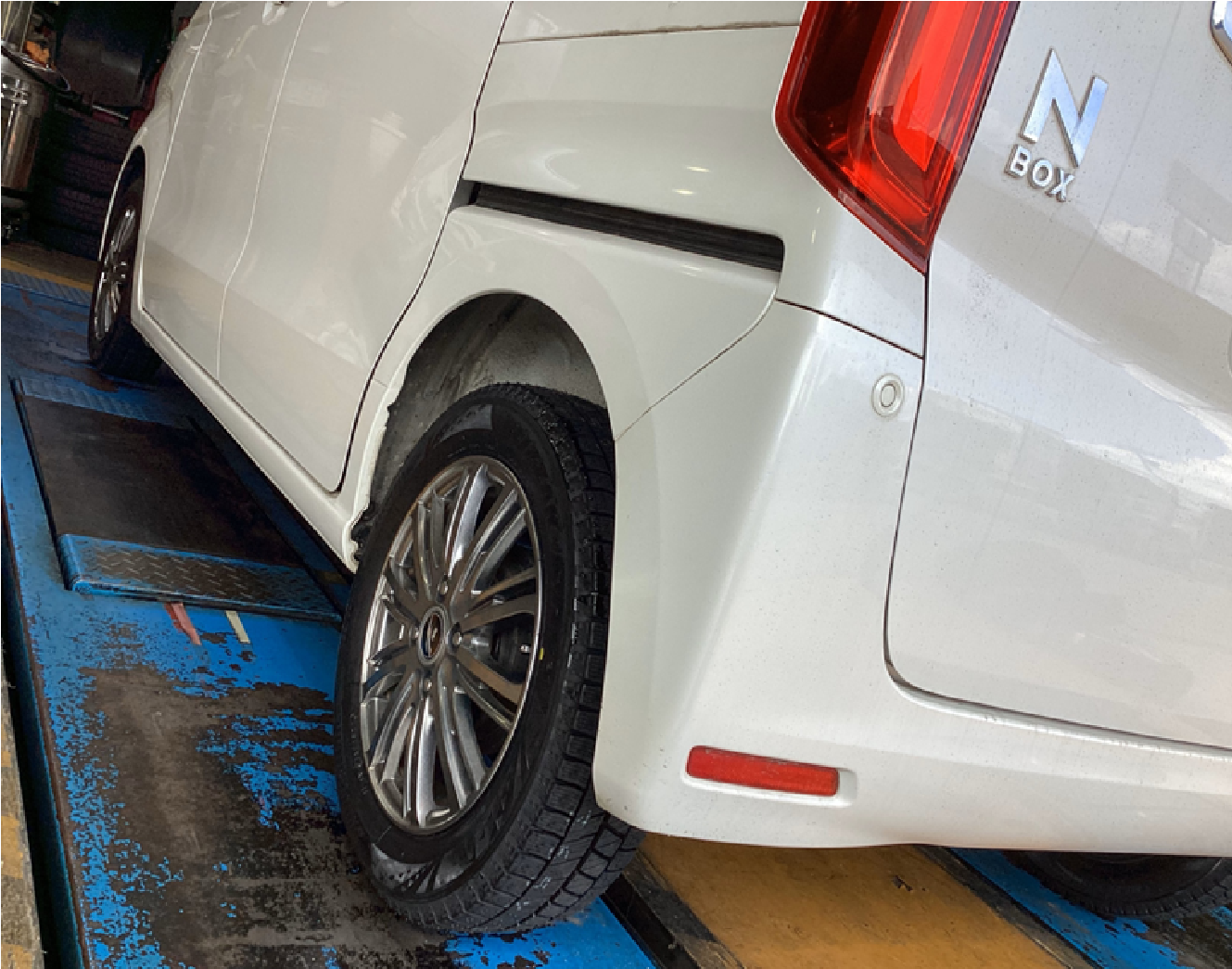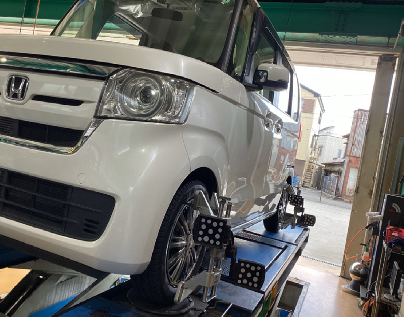 ホンダ N-BOXのスタッドレスタイヤ装着・アライメント作業です。