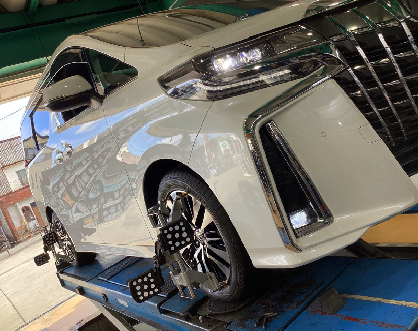 トヨタ アルファードのタイヤ・ホイールにセンサーを取り付け、タイヤの取付角度のミリ単位の数値を測ります。その数値が自動車メーカーが定める数値の範囲内かそうでないかをチェックします。
