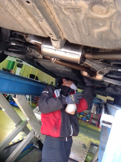 透明な液体をマフラーへ塗っていきます!そして乾かすだけ!30分程で終わりました。