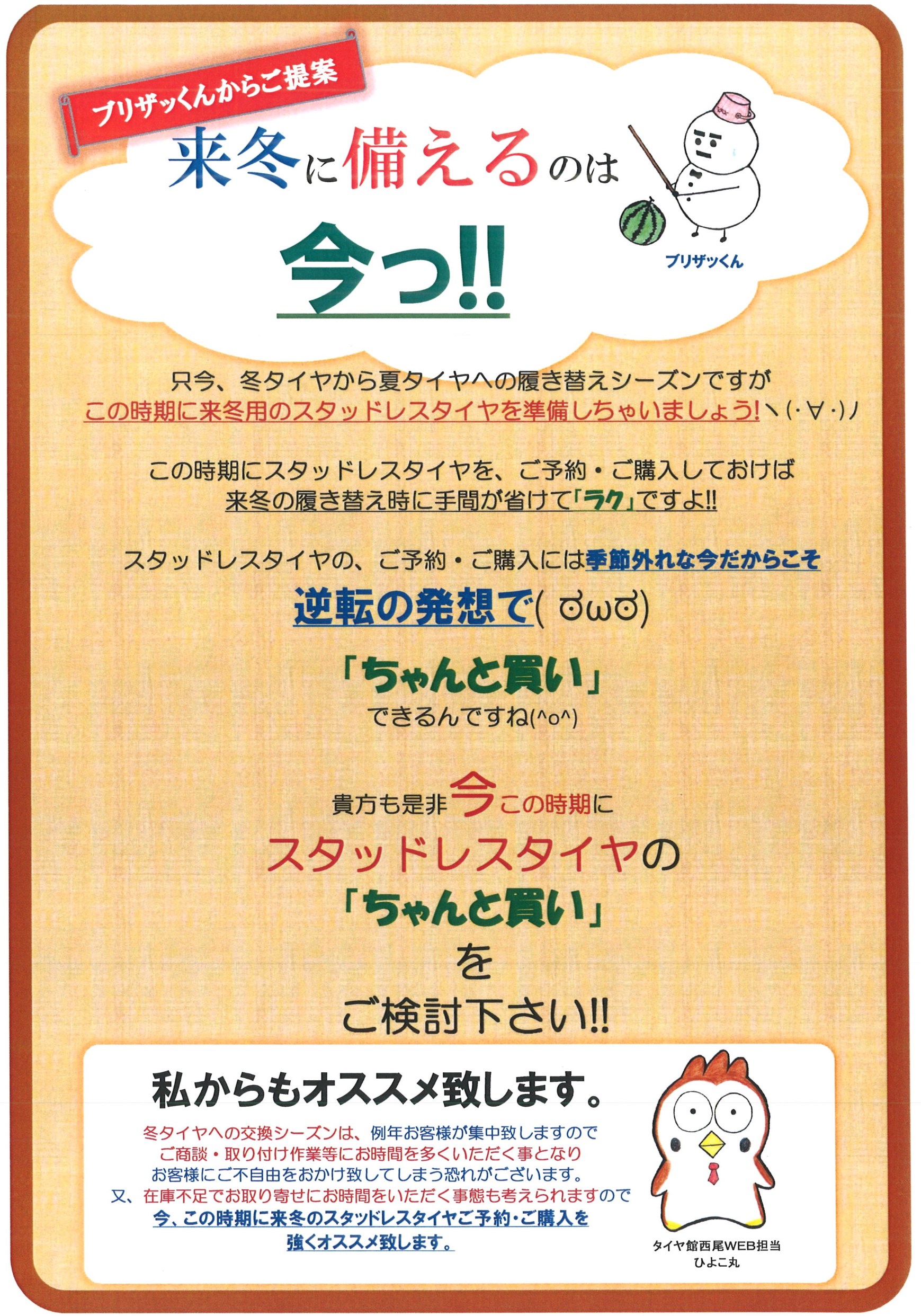 スタッドレスタイヤの普及促進の為タイヤ館で働いてます