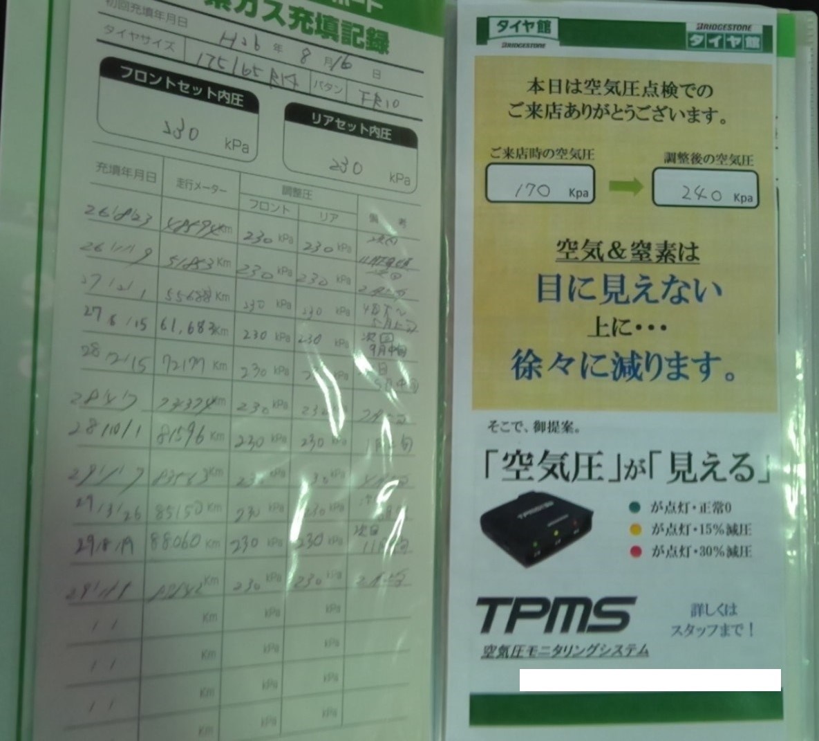 ご来店時と調整後の空気圧を記入したシートを挿入し