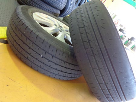 トヨタ ノア タイヤ交換&アライメント ポスト 2014年11月10日 いつもお世話になります!愛知県西尾市にあるタイヤ館西尾です!トヨタノアのタイヤ交換とアライメントです。走行距離が約5万4000km。フロントタイヤは新車装着から一度交換、リヤタイヤは新車装着のままです。フロントタイヤの外側偏減りがひどく、タイヤ交換と合わせてアライメントも実施。タイヤはミニバン専用タイヤの“エコピアPRV”です。 担当:濱口