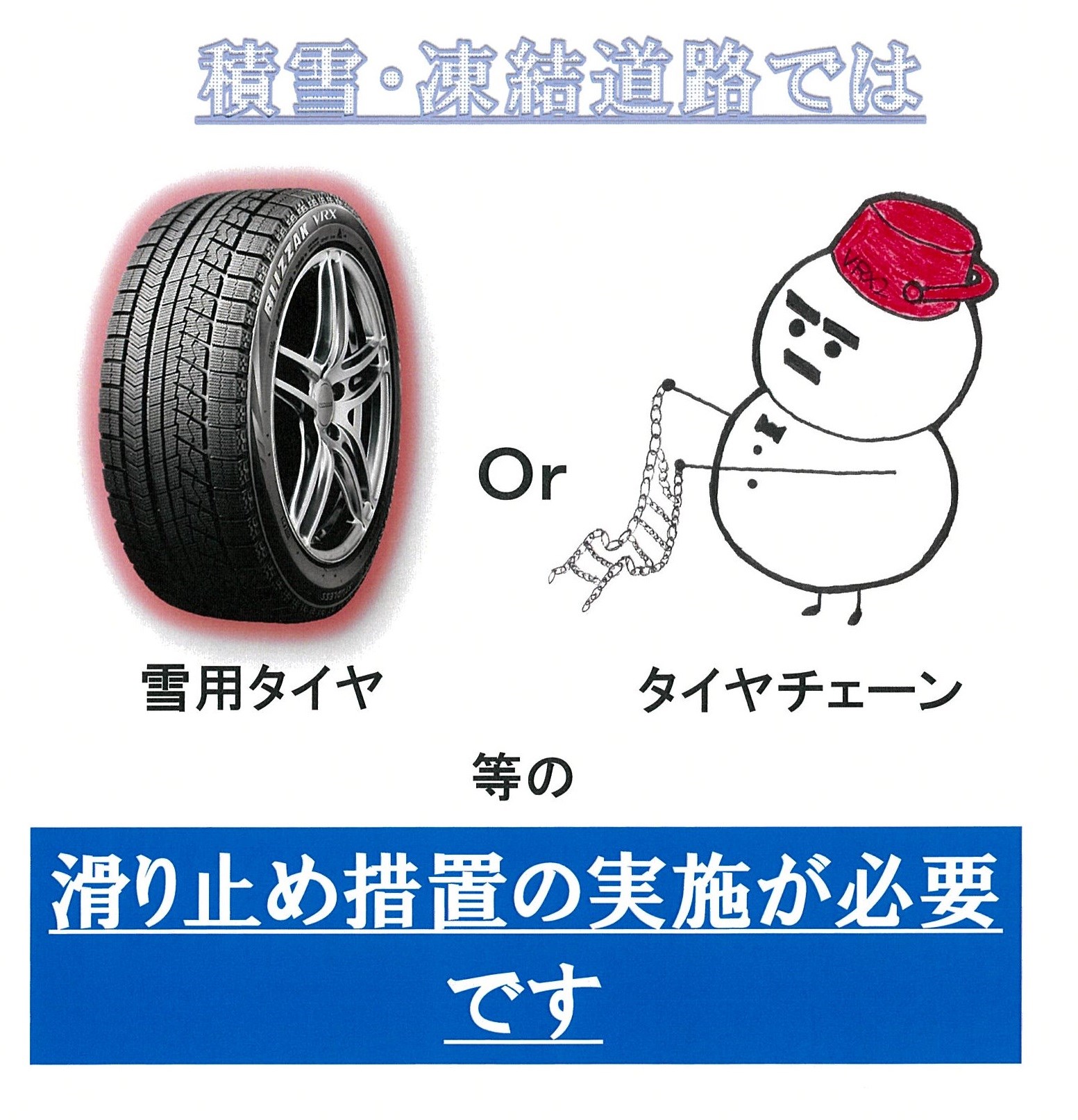 タイヤチェーンを取り付ける等滑り止めの措置を講ずること。