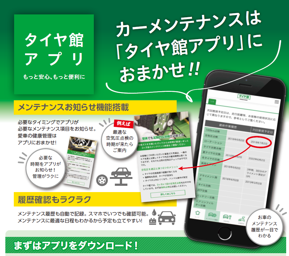 「タイヤ館アプリ」が、お客様のカーライフをサポートします。