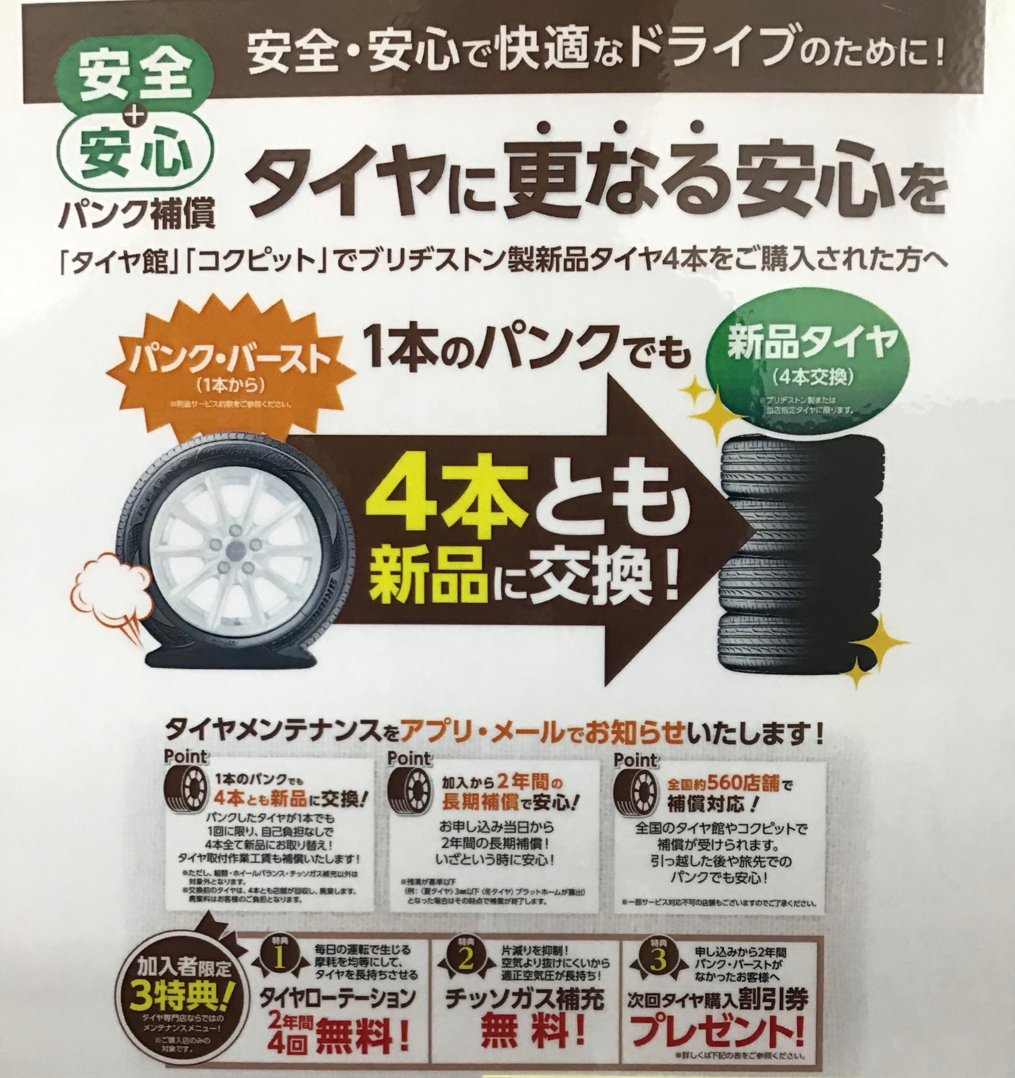 当店でブリヂストンタイヤを4本購入して頂いた方がご加入して頂けるパンク補償!