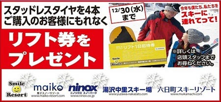 スタッドレスタイヤ4本ご成約・ご予約のお客様にはスキー場のリフト券を
