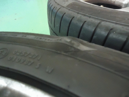 左前輪タイヤの側面(タイヤの1番弱い部分)を