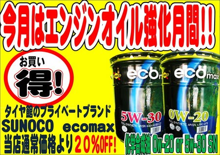 100%化学合成油の SUNOCO eco Max 0w-20 5w-30/SN が当店通常価格より20%OFF!!