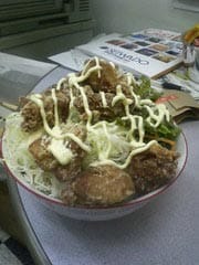 から揚げとサラダをのせました、そしてトドメにカラシマヨネーズをたっぷり