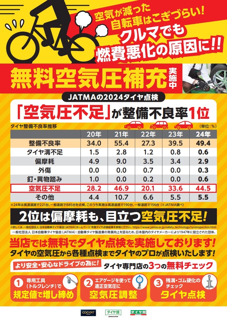 タイヤの空気圧チェックしていますか? ポスト 2025年3月7日 タイヤ館 西荻窪 住所:167-0053東京都杉並区西荻南1-2-1 電話番号: 03-5336-6265 相談予約 タイヤ点検・安全点検/タイヤ履き替え/オイル交換/その他ピット作業の予約