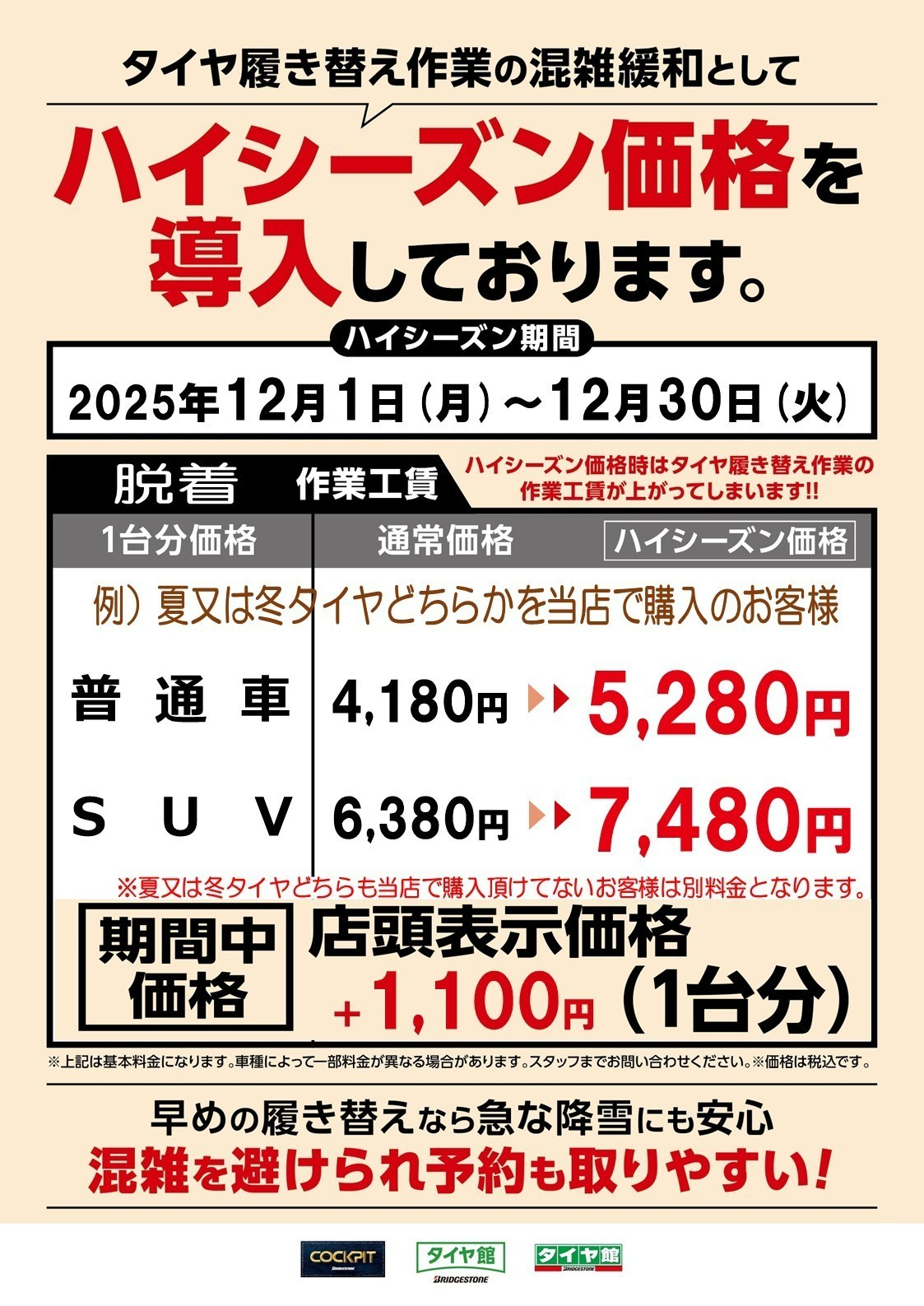 冬タイヤ履き替え【ハイシーズン価格】のお知らせ☆