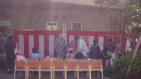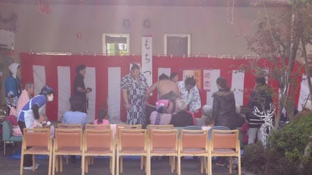 タイヤ館のお向かいさんの奉優会さん(デイケアサービス)で、毎年恒例の餅つき大会。