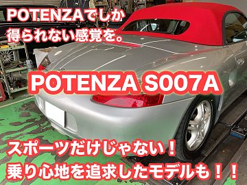 みなさんこんにちは! 今回はブリヂストンのプレミアムタイヤPOTENZA S007Aをご紹介! 操舵性の安定感はバツグン!d(^_^o) キビキビとした走り心地×コンフォート性能 走るのが楽しくなる、気持ちいいタイヤです! ぜひ、候補に入れてください!! ご利用ありがとうございました!
