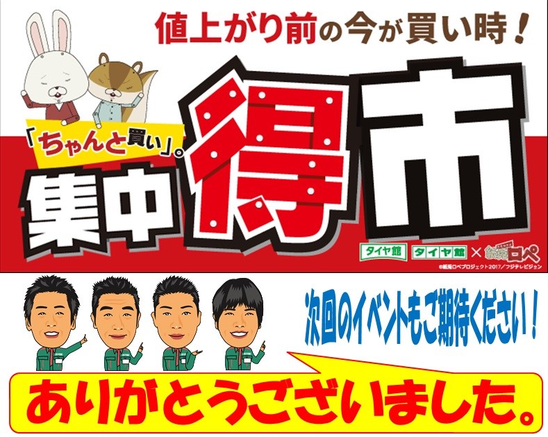 集中得市多くの、ご来店ありがとうございました。 ポスト 2017年5月31日 5月20日から5月31日までの 集中得市にたくさんのご来店、お買い上げ、 誠にありがとうございました! 夏のお車のケアも タイヤ館西脇にお任せください! まだまだ無料点検継続中ですヨ! 気温が高くなる季節です! カーメンテナンスをしっかりしときましょう! 次回も皆様に喜んでいただけるような企画を 計画中ですので、楽しみにしていてくださいね! カテゴリ:お知らせ