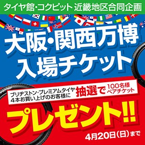 いつもタイヤ館西脇のWEBページを ご覧いただきありがとうございます! 55年ぶりの大阪での開催となる『大阪・関西万博』! テレビ・ネットなどでも盛り上がりを見せていますね。 この度、タイヤ館・コクピット近畿地区合同企画といたしまして、 『タイヤを買って万博へ行こう!!』 『大阪・関西...