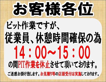 タイヤ館西脇店です。 誠に勝手ではありますが、 2025年2月より従業員の休憩時間確保の為 14:00~15:00の間 PIT作業を休止させていただきます。 ご迷惑をおかけいたしますが 何卒ご理解ご協力の程、宜しくお願い致します<m(__)m> ※お見積り等の店頭受付は実施させていただきます。