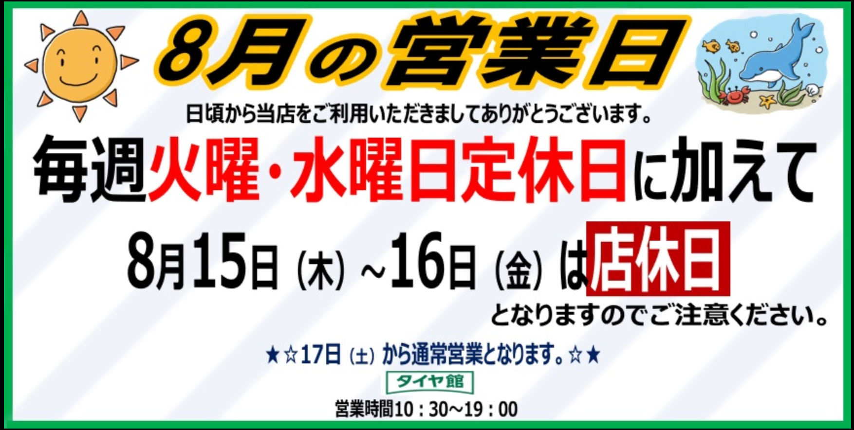 タイヤ館西脇店です! いつもHPをご覧頂きありがとうございます! 8/13(火)〜8/16(金)はお盆休みです!! 8/17(土)から通常の10時30分より営業いたします! 皆様のご来店お待ちしております。 - - - メール問い合わせ受付中 - - - クリック▷▶︎▷メール問い合わせはコチラ メール相談を頂きましたら 順...
