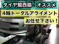 タイヤ館西脇店では4輪トータルアライメントのご依頼を承っています。 測定後のデータを元にしっかりご説明致しますよ!! 西脇市・加東市・加西市・丹波市・篠山市・多可郡にお住まいのお客様へ ご依頼お待ちしております!! アライメントについて ご依頼はWEBからでもご予約頂けます! ウェブメ...