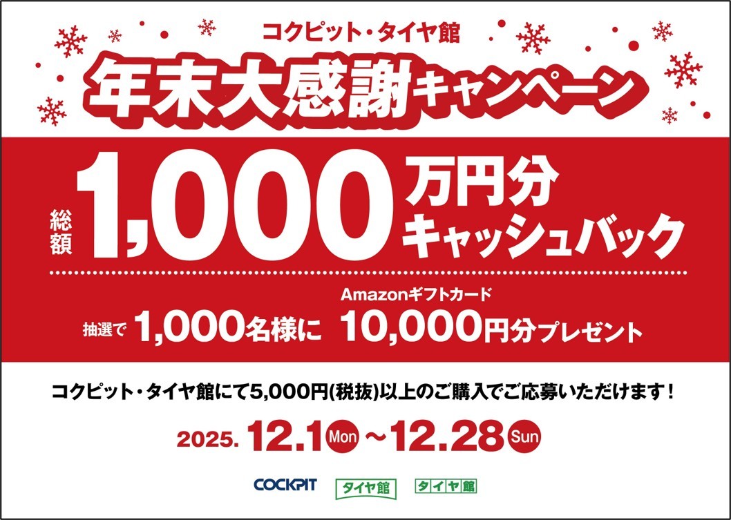 コクピット・タイヤ館にて1会計につき5,000円(税抜き)以上のご購入でご応募出来ます!