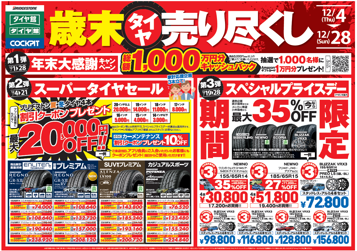 2025年12月4日(木)から12月21日(日)まで、全国の対象店舗にてブリヂストンタイヤ4本購入で