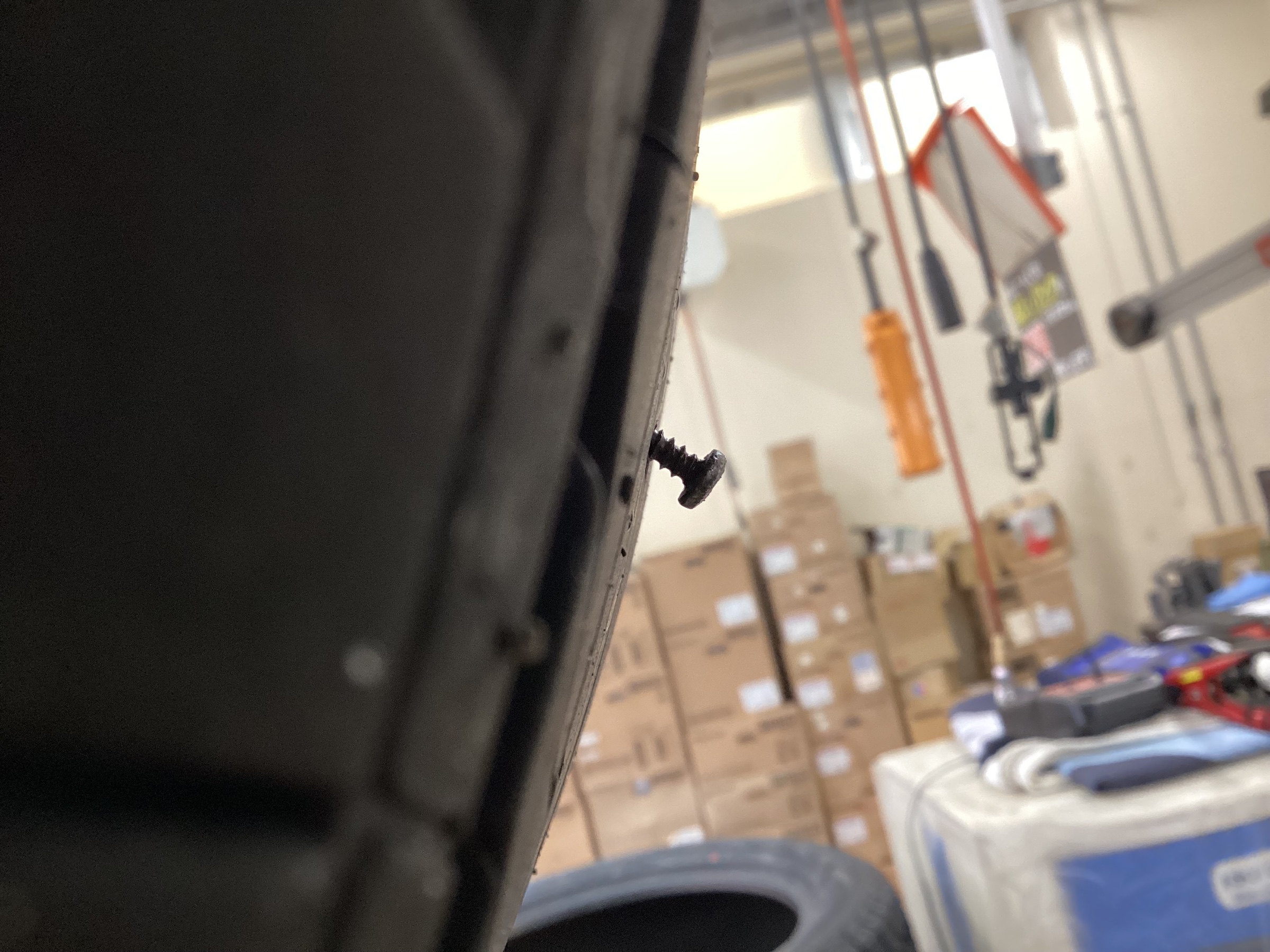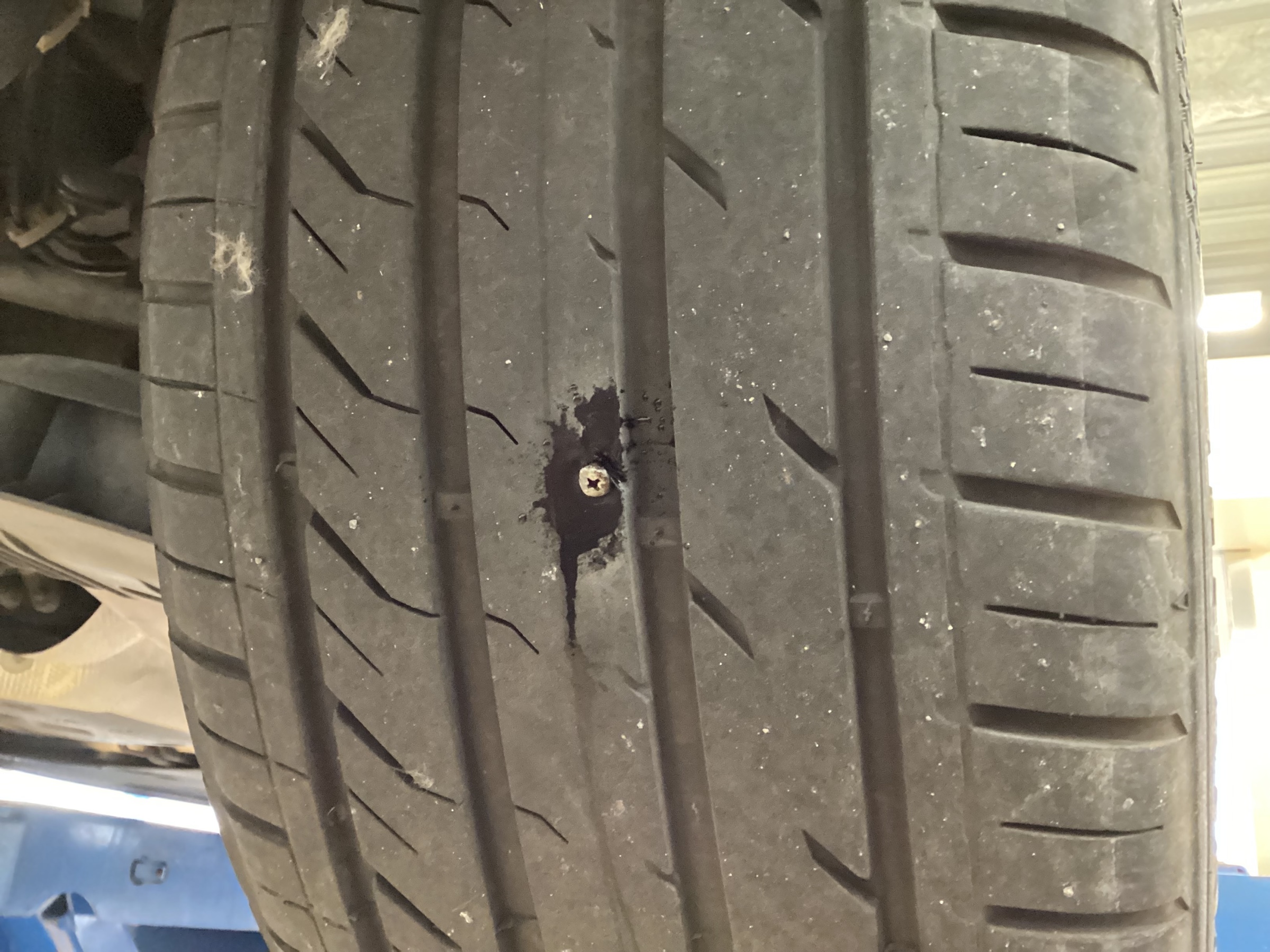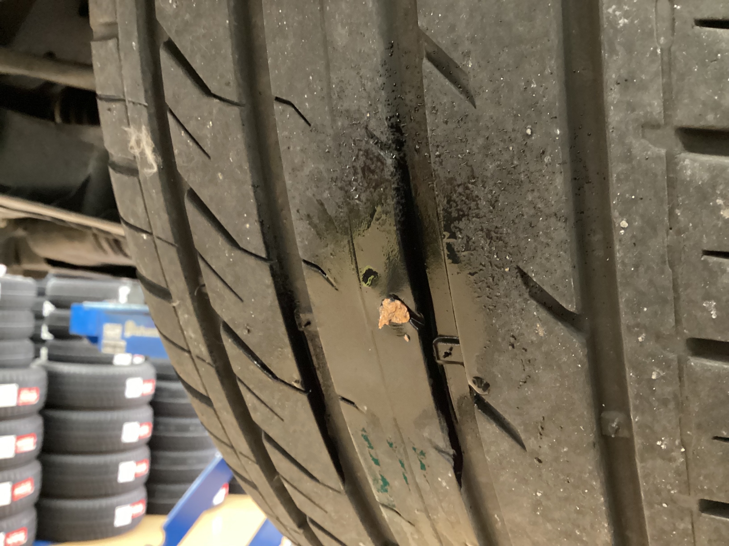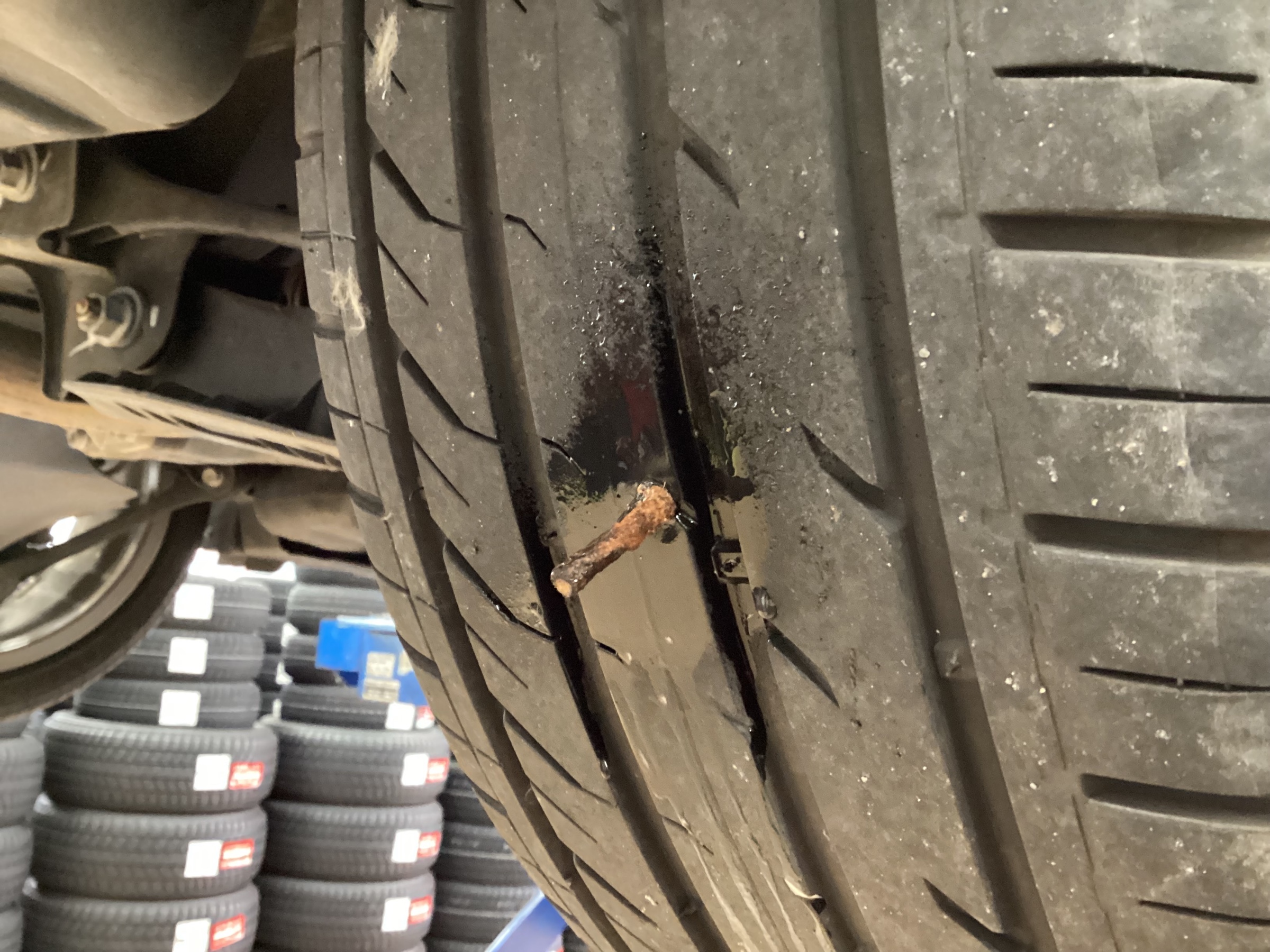 タイヤの真ん中に釘が刺さってしまっています。