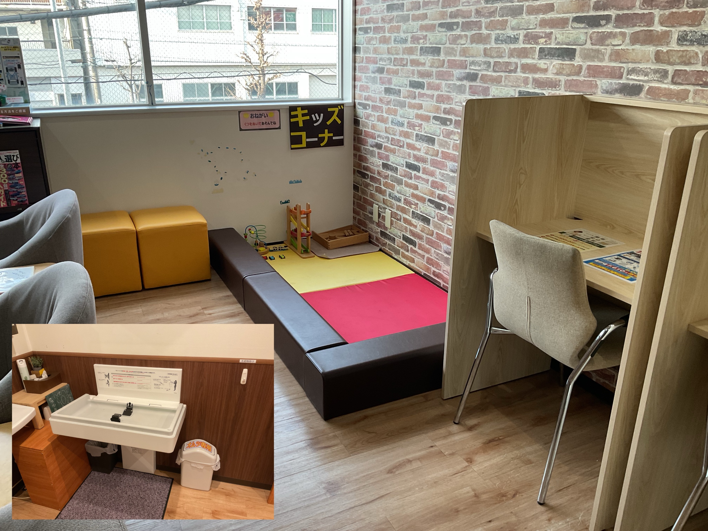 お子様とご来店いただいた際は、多目的トイレにおむつ交換台がございます。