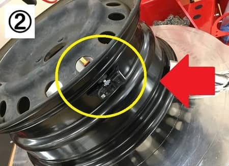 ・写真②:送信機はホイールの空気注入口に取り付けます。