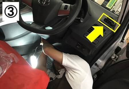 ・写真③:車内に受信機を設置します。電源はシガーのところから取ります。
