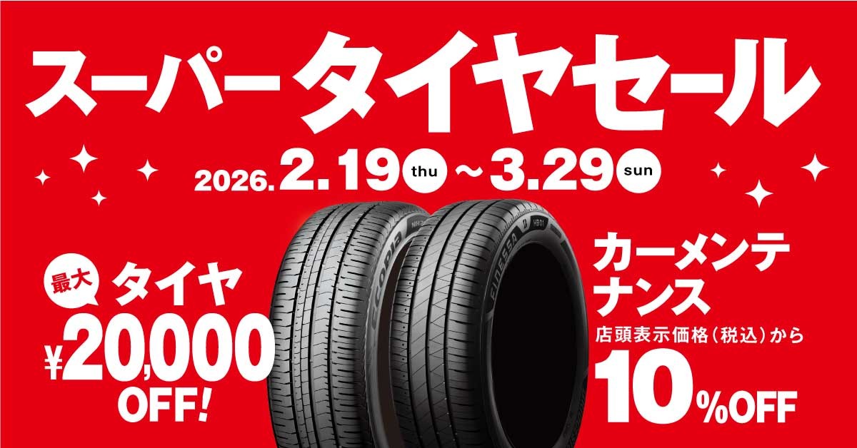 スーパータイヤセール開催します!! ポスト 2026年2月13日 いつも当店をご利用いただきましてありがとうございます。 2/19(木)~3/29(日)まで、スーパータイヤセールを開催いたします。 ブリヂストンのタイヤを4本ご購入で、最大¥20,000OFF!! メンテナンス用品は店頭表示価格より10%OFF(オイル・バッテリー・ワイパー・エアコンフィルター) 大変お得にご購入いただける大チャンスです!! タイヤのプロである、当店スタッフがお客様のカーライフに合わせたタイヤ選びを しっかりと、お手伝いさせていただきます。 タイヤ館 西横浜 住所:220-0061神奈川県横浜市西区久保町6-23 電話番号: 045-260-6171 相談予約 カテゴリ:タイヤ関連 その他メンテナンス オイル関連