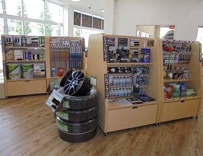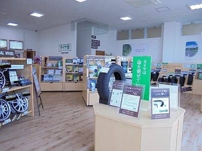 左からホイール、メンテナンス用品等、タイヤが置いてあります。