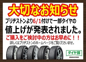 6/1からブリヂストンタイヤが値上げすることをお知らせしてから多くのお客様より