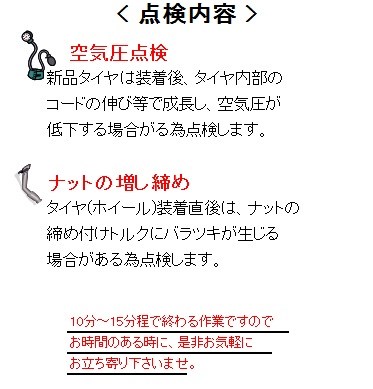 タイヤ交換後、100kmまたは1週間経ったら一度点検をお願いしております。