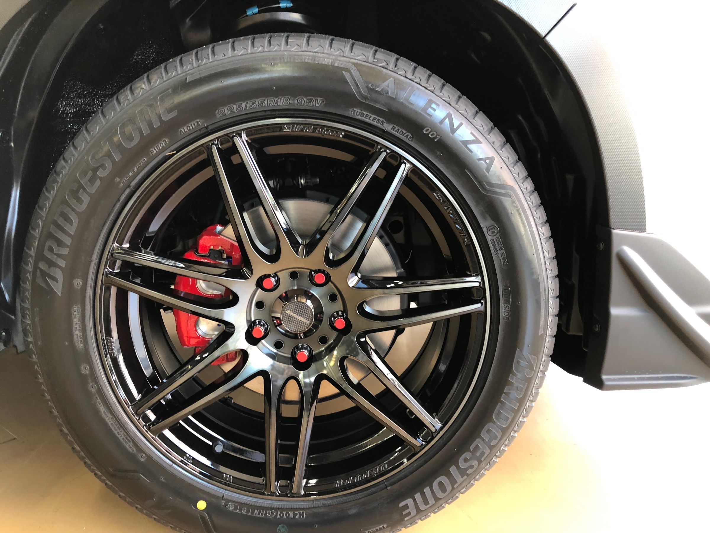 人気のキャリパー塗装でワンポイントカスタム。アライメントもフロントキャンバー(路面に対してタイヤの立っている角度)フロント、リアのトー(タイヤの向いている角度)を調整し、偏摩耗の抑制。