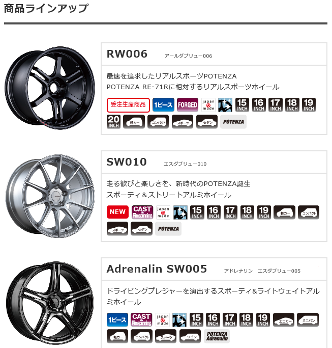 POTENZAブランドを冠するアルミホイールブランドとして、POTENZA RE-71RやPOTENZA Adrenalin RE003等のタイヤ別コンセプトをベースにコンペティティブでスポーティーな外観と性能を追求したプレミアムスポーツ&スポーティホイールブランド。