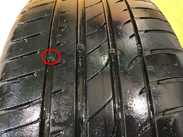 画像の赤丸の部分がスリップサインです。これが接地面に露出するとタイヤの使用限度を超えたことになります。現在露出には至っていませんがそれに近い状態ですのでタイヤの交換時期と言えます。