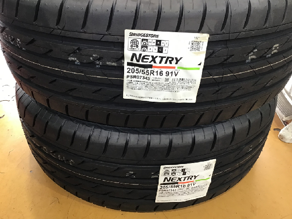 お客様はお車を次の車検までに手放されるご予定ということでした。今回選ばれたタイヤはブリヂストンの「NEXTRY」というタイヤです。ブリヂストンタイヤの中でベーシックな商品、今後の使用用途にもあっていると思われます。