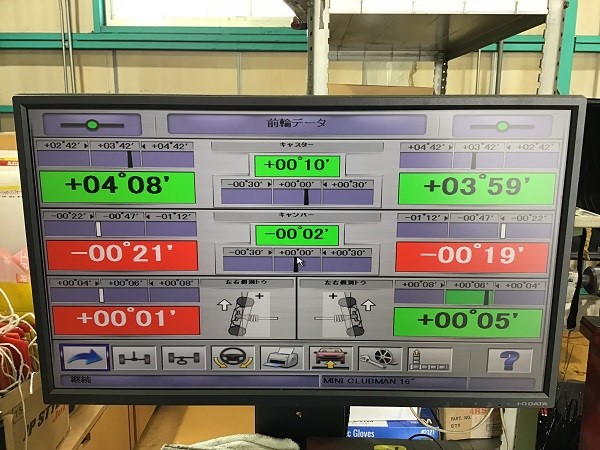 足回りがどのような角度になっているのかが数値化されます。角度が大きく変わってしまっている部分を調整して(戻して)あげるとタイヤの負担は軽減してタイヤも長持ちしやすくなります。