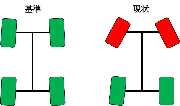 前タイヤがトーイン(タイヤの先が閉じて内股の状態)。