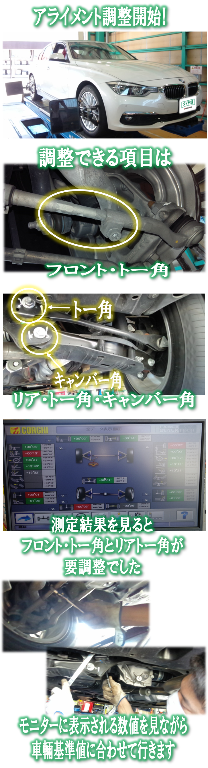 f30【BMW3シリーズ】のタイヤ交換&アライメント調整