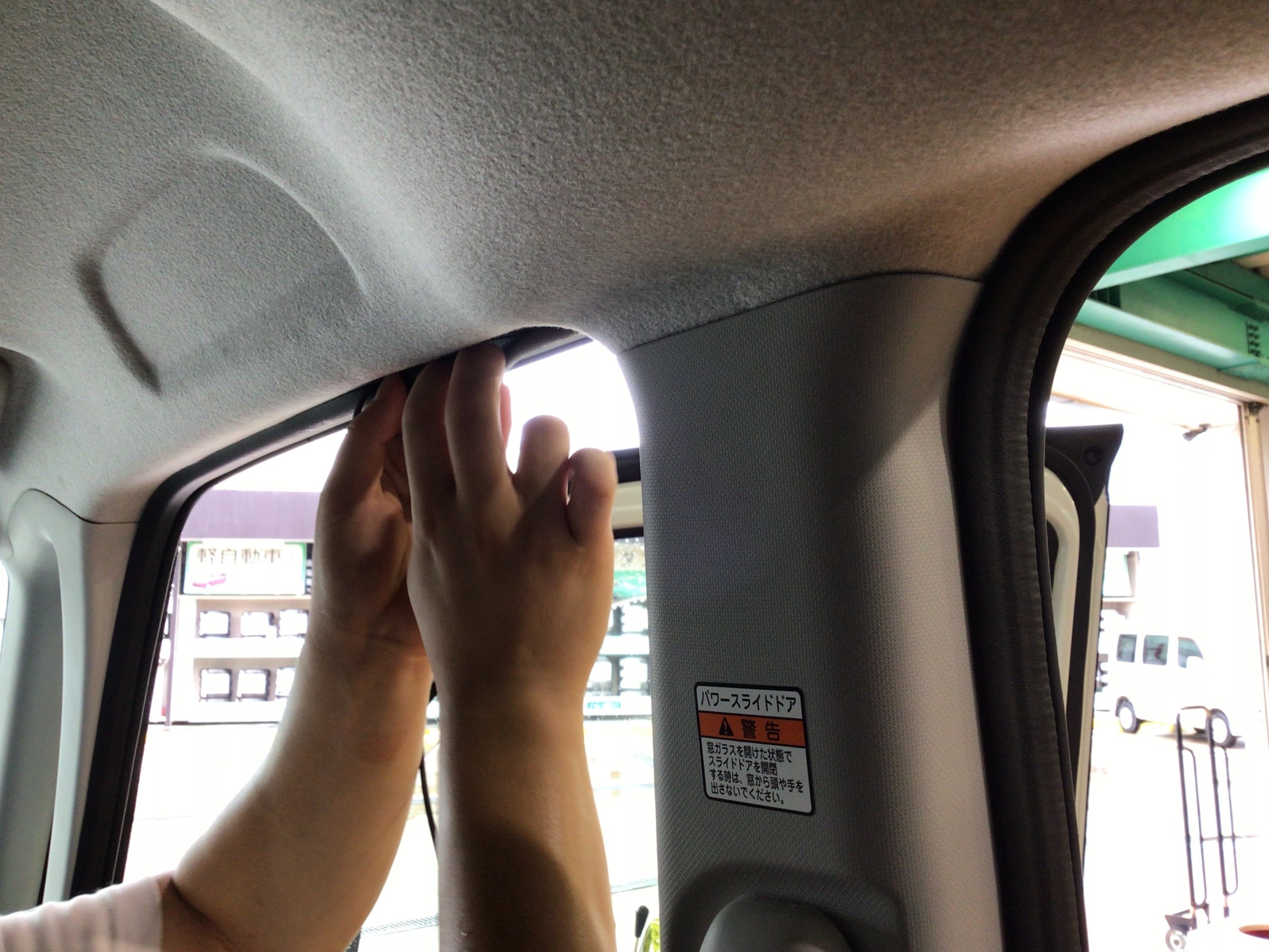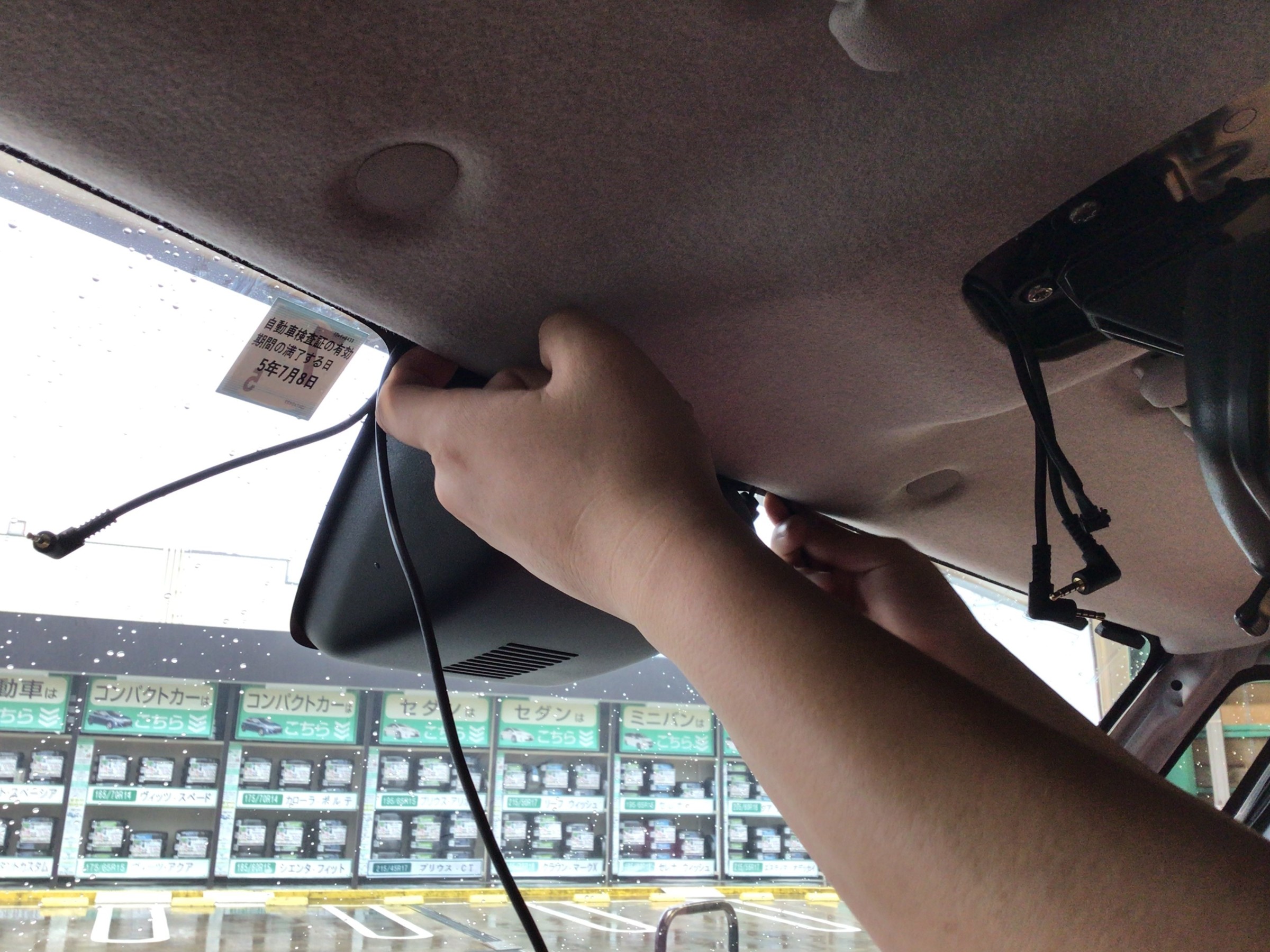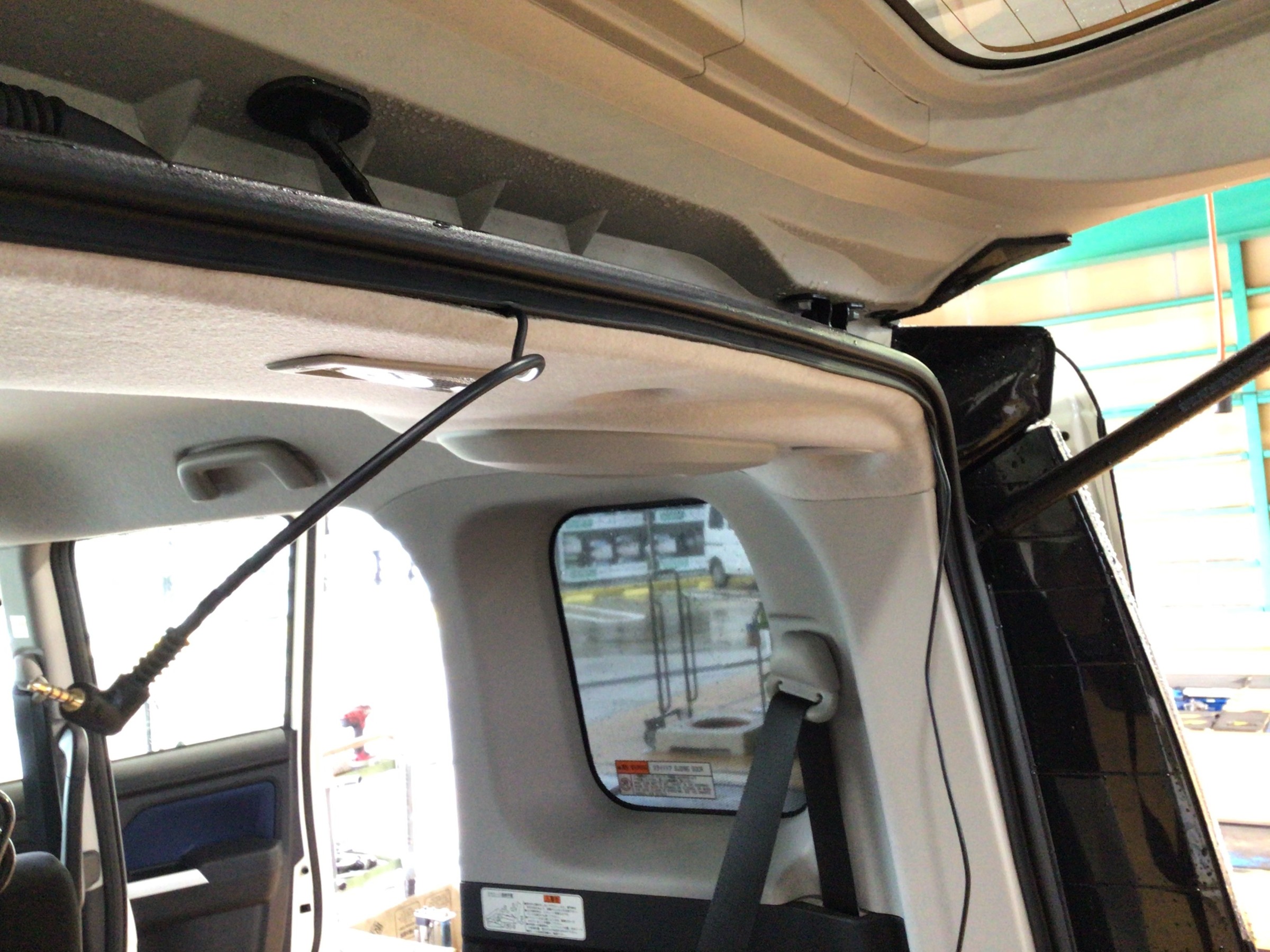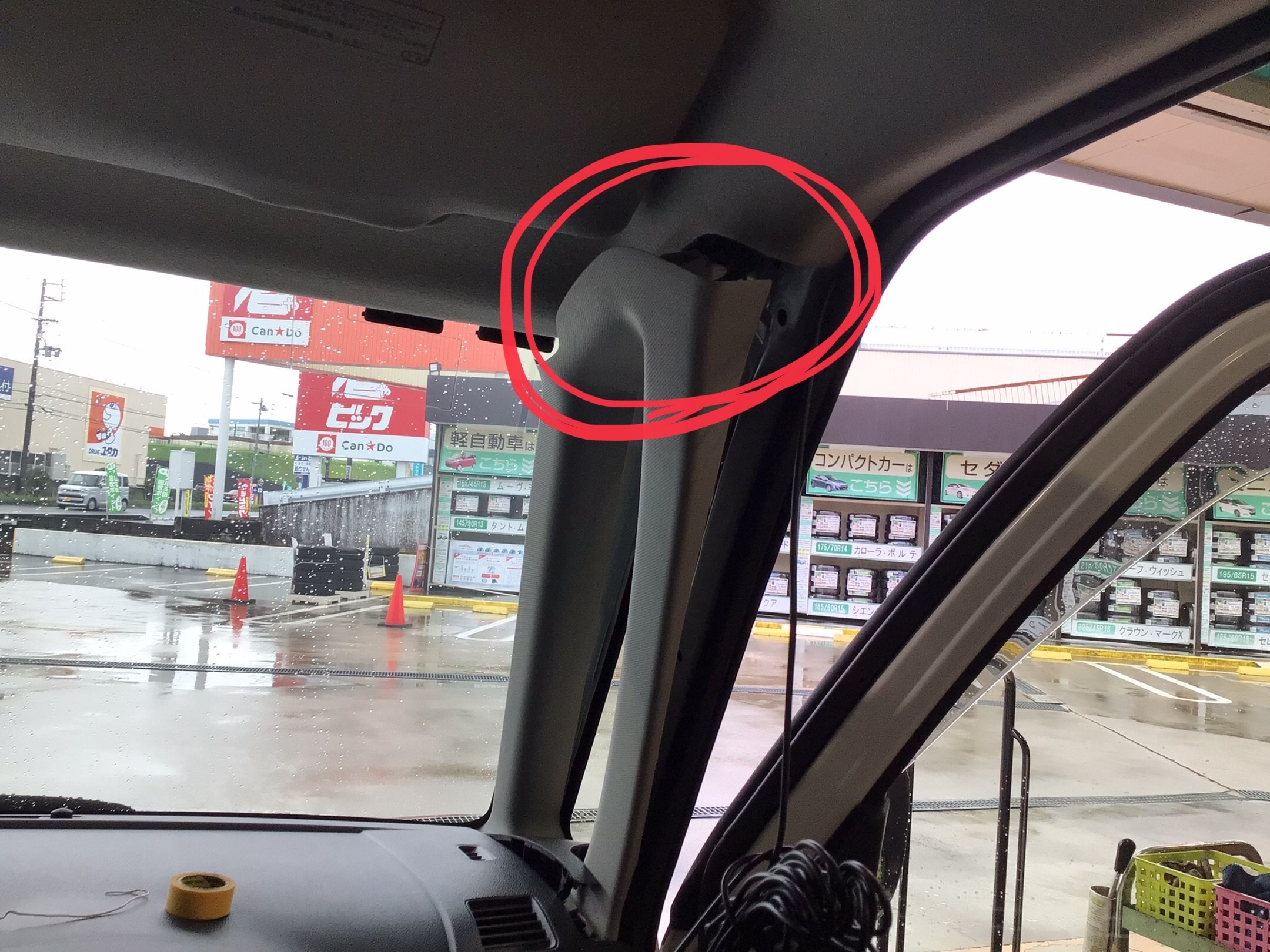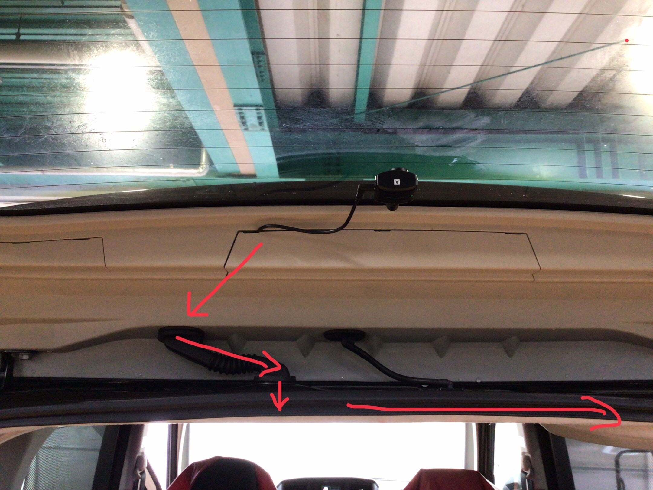 リアガラスに取付したカメラの配線が表に出ないように内装に通していきます。