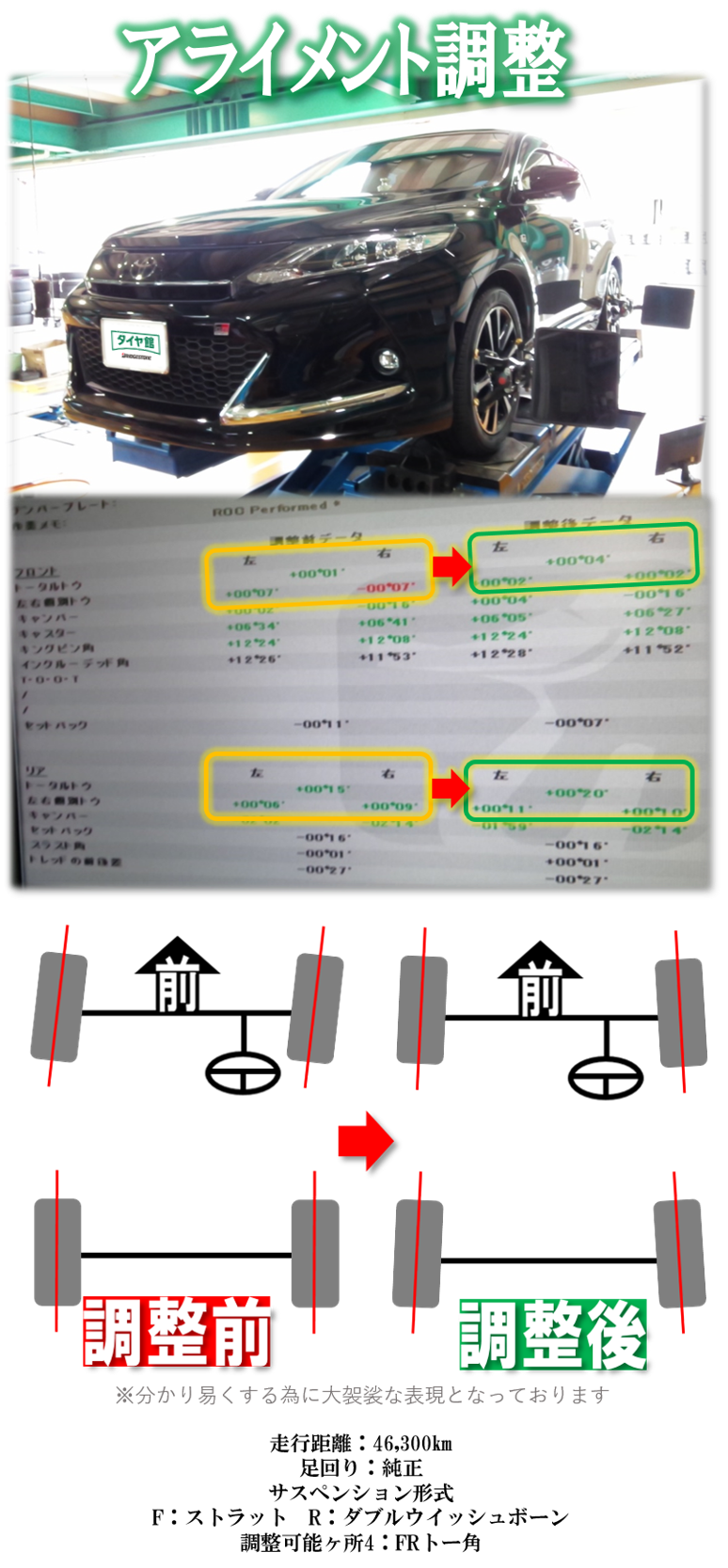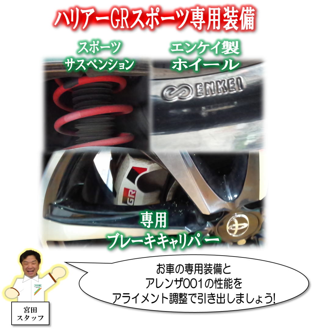 【ALENZA001】トヨタハリアーGRスポーツのタイヤ交換&アライメント調整
