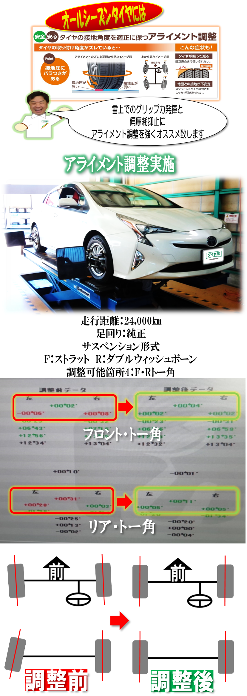 【オールシーズンタイヤ】トヨタ50プリウスのタイヤ交換&アライメント調整